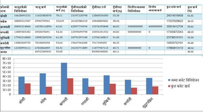 सो अवधिमा बागमती प्रदेशले ५० दशमलव ६२ प्रतिशत, गण्डकी प्रदेशले ४८ दशमलव १९ प्रतिशत, लुम्बिनी प्रदेशले ५५ दशमलव ५४ प्रतिशत, कर्णाली प्रदेशले ४५ दशमलव ६० प्रतिशत र सुदूरपश्चिम प्रदेशले ४८ दशमलव ५४ प्रतिशत बजेट खर्च गरेको देखिन्छ । सो अवधिमा चालुतर्फको औसत खर्च ५५ दशमलव ६८ प्रतिशत र पुँजीगततर्फको औसत खर्च ४६ दशमलव ११ प्रतिशत छ ।
