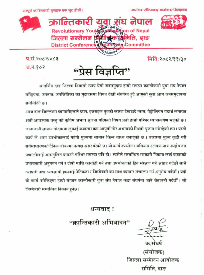 काठमाडौँ।क्रान्तिकारी युवा सङ्घ नेपाल दाङ जिल्ला समितिले दाङ जिल्लामा व्यापारीहरूले इरान इजरायल युद्धको कारण देखाउँदै ग्यास , पेट्रोलियम पदार्थ लगायत अति आवश्यक वस्तुको कृत्रिम अभाव सिर्जना गरिएको विषयप्रति चेतावनी दिएको छ। क्रान्तिकारी युवा सङ्घ नेपाल दाङ जिल्ला समितिका संयोजक सङ्घर्षले२०८२ फागुन ३० गते एक प्रेस विज्ञप्ति जारी गर्दै सो चेतावनी दिएका हुन्। विज्ञप्तिको पूर्णपाठ यस प्रकार छ–