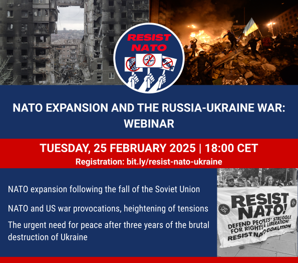 This webinar will look at NATO expansion following the fall of the Soviet Union, NATO and US war provocations that heightened tensions in Eastern Europe, and the urgent need for peace after three years of the brutal destruction of Ukraine.To get involvement in the resist NATO 2025 campaign contact Resistnato@proton.me.