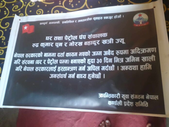 सुर्खेत । सुर्खेत जिल्लाकोसाविक लेकपराजुल गा.वि.स. (वडा नं ९ ) १८३ नं कित्ता मालपोत कार्यालयमा फिल्डबुक स्रेष्ता कायम भएको सरकारी जग्गा हाल सुर्खेत जिल्लाको भेरी गंगा नगरपालिका वडा नं १२ को छिन्चु बजारमा पर्ने अर्थात रत्नराजमार्गको उत्तरमा पर्ने सरकारी जग्गा हिनामिना भएको छ । सोही वडा बस्ने नेपाली कांग्रेसका क्षेत्रीय कोषाध्यक्ष र सोही वडा बस्ने रद्र कुमार पुनले हाल सडकको लगत कट्टा हुँदा २१४५–२१४६ –२१४७ मध्येको २१४६ नं कित्ता जग्गा अतिक्रमण गरी घर बनाएको हुँदा सो विषयमा अख्तियार दूरोपयोग अनुसन्धान आयोग, जिल्ला प्रशासन कार्यलय सुर्खेतमा उजुरी गर्दा पनि आवश्यक छानविन प्रक्रिया अगाडि नबढाइएको र निजहरुले सो सरकारी जग्गा जालसाजी गरी सुकुम्बासी समस्या समाधान आयोग सुर्खेतबाट आफ्ना नाउँमा ल्याउनको लागि सोही वडाका वडा अध्यक्ष रामबहादुर डाँगी र भेरी गंगा नगरपालिकाको मेयर यज्ञप्रसाद ढकाल र नगर कार्यपालिका अधिकृत कृष्ण पोख्रेलले सो सरकारी जग्गा निज व्यक्ति विशेषको नाममा ल्याउन सुकुम्बासी समाधान आयोगलाई सिफारिस गरेको हुँदा