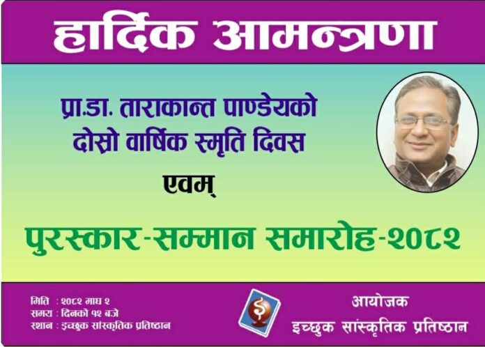 काठमाण्डौ । इच्छुक साँस्कृतिक प्रतिष्ठानको आयोजनामा प्रा.डा.ताराकान्त पाण्डेयको दोस्रो वार्षिक स्मृति दिवश एवम् पुरस्कार वितरण तथा सम्मान कार्यक्रम हुँदै छ । २०८२ माघ २ गते इच्छुक साँस्कृतिक प्रतिष्ठानमा दिनको १२ बजे हुने आयोजकले बताएको छ । कार्यक्रममा सहभागिताकोलागि सबैमा अनुरोध गरिएको छ ।