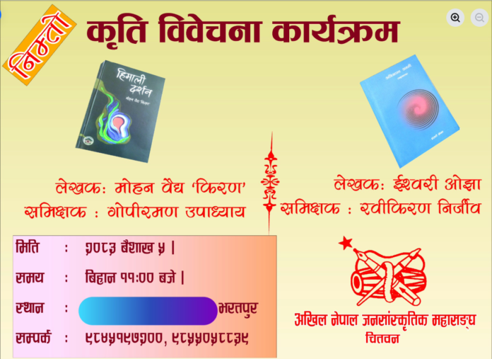 काठमाडौँ । लेखक मोहन वैद्य ‘किरण’ को पुस्तक “हिमाली दर्शन ” र ईश्वरी ओझाको महाकाव्य “अविश्रान्त अवनी”माथि विवेचना हुने भएको छ। किरणको पुस्तकमाथि अर्का लेखक गोपी रमण उपाध्यायले समीक्षात्मक टिप्पणी राख्नुहुनेछ भने ईश्वरी ओझाको पुस्तकमाथि रवि किरण निर्जीवले समीक्षात्मक टिप्पणी राख्नुहुनेछ । २०८३ साल वैशाख ५ गते चितवनको भरतपुरमा उक्त पुस्तक विवेचना कार्यक्रम हुन थालेको हो। बिहान ११ बजे देखि उक्त कार्यक्रम सुरु हुने आयोजकहरुले बताएका छन् । यो पुस्तक विवेचना कार्यक्रमको आयोजना अखिल नेपाल जनसांस्कृतिक महासङ्घले गर्दैछ।