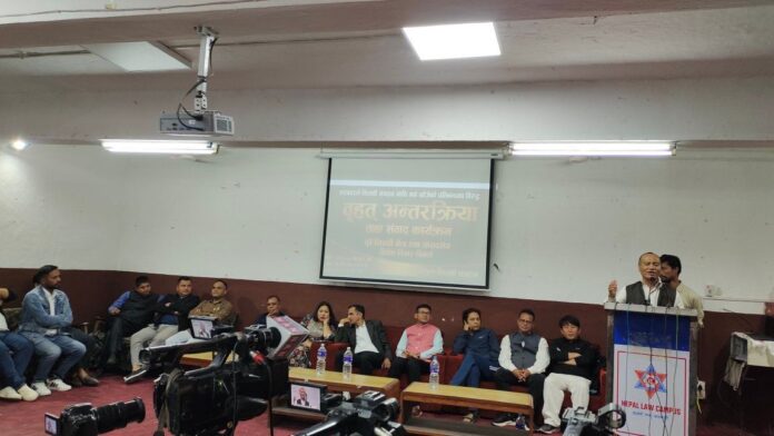 काठमाण्डौ । शैक्षिक संस्थाहरुमा विद्यार्थी संगठनहरुमाथि प्रतिबन्ध लगाउने सरकारको निर्णयका विरुद्धमा सडक सदन र कानुनी क्षेत्रबाट संघर्ष चर्काउने उद्घोष भएको छ । देशमा क्रियाशील १५ विद्यार्थी संगठनहरुले संयुक्त रुपमा सरकारको निर्णय विरुद्ध संगठनमाथिको प्रतिबन्धको विषयमा वृहद अन्तरक्रिया तथा संवाद कार्यक्रम वैशाख ६ गते नेपाल ल क्याम्पसमा आयोजना गरेका थिए । कार्यक्रममा सांसद तथा पूर्व विद्यार्थी नेताहरु र हालका विद्यार्थी नेताहरु,कानुन,व्यवसायी पत्रकारको उपस्थिति रहेको थियो । कार्यक्रममा बोल्ने पूर्व विद्यार्थी नेता तथा सांसद र कानुन व्यवसायी वक्ताका रुपमा रहनु भएको थियो । वहाँहरुले प्रतिबन्धका विरुद्ध सडक ,सदन र कानुनी क्षेत्र सबै मोर्चाको प्रयोग गर्नु पर्ने धारणा राख्नु भयो ।
