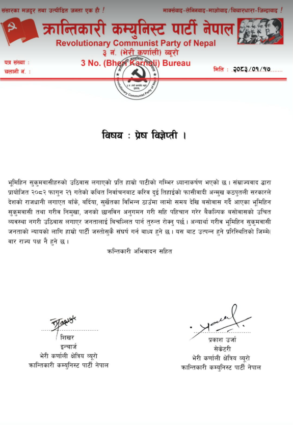 काठमाडौ । क्रान्तिकारी कम्युनिस्ट पार्टी नेपाल ३ नम्बर व्यूरो (भेरी कर्णाली व्यूरो) ले सुकुम्बासीहरुलाई बिचल्ली पार्न नहुने बताएको छ । व्यूरो इन्चार्ज शिखर र सेक्रेटरी प्रकाश ऊर्जाले संयुक्त विज्ञप्ति जारी गर्दै सुकुम्बासीहरुलाई बिचल्ली पार्न नपाइने र बिना तयारी सुकुम्बासीहरुलाई उठिबास लाउने सरकारको कार्यको विरोध गरेका छन्।२०८३ वैशाख १७ गते उक्त विज्ञप्ति प्रकाशित गरिएको हो। विज्ञप्तिमा भनिएको छ –“भूमिहिन सुकुम्बासीहरूको उठिबास लगाएको प्रति हाम्रो पार्टीको गम्भीर ध्यान आकर्षण भएको छ। साम्राज्यवादद्वारा प्रायोजित २०८२ फागुन २१ गतेको कथित निर्वाचनबाट करिब दुई तिहाइको फासीवादउन्मुख कठपुतली सरकारले देशको राजधानी लगायत बाँके, बर्दिया, सुर्खेतका विभिन्न ठाउँमा लामो समयदेखि बसोबास गर्दै आएका भूमिहिन सुकुम्बासी तथा गरिब निमुखा जनताको छानबिनअनुगमन गरी, पहिचान गरेर वैकल्पिक बसोबासको उचितव्यवस्था नगरी उठिबास लगाएर जनतालाई विचलित पार्न तुरुन्त रोक्नुपर्दछ। अन्यथा भूमिहीन गरिब सुकुम्बासीजनताको न्यायको लागि हाम्रो पार्टीजस्तोसुकै सङ्घर्ष गर्न बाध्य हुनेछ। यसबाट उत्पन्न हुने परिस्थितिको जिम्मेवार राज्यपक्ष नै हुनेछ ।”