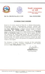महासचिव महेन्द्र बश्यालले कोमल सिंह सँँग पोलिस स्टेशनको नंबर मागेर इन्सपेक्टरलार्र्इ सबै कुरा सम्झाएर बात गरे र हस्पिटलबाट रिपोर्ट मगाए। पोलिसले रिपोर्ट पठायो। उक्त रिपोर्टमा पानीमा डुवेर मरेको कुरा हस्पिटलले स्पष्ट उल्लेख गरिएको थियो। त्यो रिपोर्ट नेपाली दूतावासलाई तुरंत पठाएर सबै कुरा सम्झाए। दूतावासले अखिल भारत नेपाली एकता समाजलार्इ धन्यवाद दिदै तुरंत नो अबजेक्सन लेटर पोलिस स्टेशनमा पठायो। पोलीस इन्सपेक्टरले पनि खुसी भएर धन्यवाद दिदै पोष्टमार्टमको तयारी त गर्यो तर समयको अभावले गर्दा निजको दाहसंस्कार ६ अप्रेल २०२६ का दिन हुने भएको छ। धिरजका परिवारले पनि एकता समाजलार्इ धन्यवाद दिएका छन। यस्तै घटना कोईम्बातुरमा पनि घटेको थियो र अखिल भारत नेपाली एकता समाजले मिलाएको थियो। दुःखद घडीमा अखिल भारत नेपाली एकता समाजले निज धिरजको दुःखद निधन प्रति गहिरो दुःख प्रकट गर्दै शोकाकुल परिवार प्रति हार्दिक समवेदना प्रकट गरेको छ ।