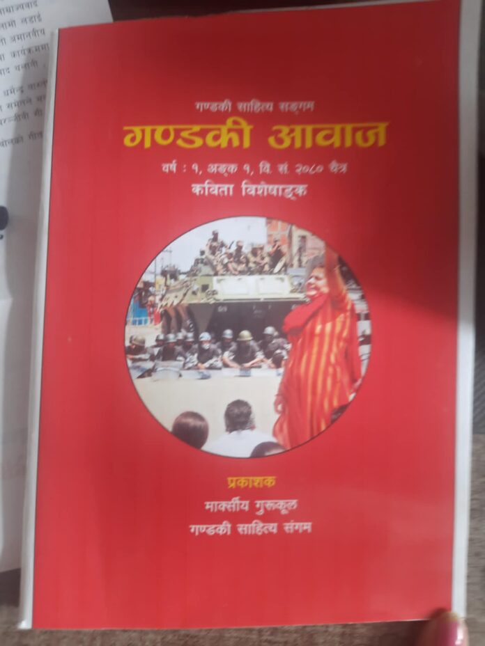 काठमाण्डौ । “गण्डकी आवाज” कविता विशेषाङ्क बजारमा आएको छ । माक्र्सीय गुरुकूल गण्डकी साहित्य संगमले २०८० चैत्रमा वर्ष १ अंक १ प्रकाशित गरेको हो । कभरपृष्ठबाहेक ९२ पृष्ठको रहेको विशेषाङकमा देश भरिका ४२ प्रगतिशील साहित्यकारहरुको कविताहरु समावेश गरिएको छ । साधारण मूल्य रु १०० र संस्थागत मूल्य रु २५० रहेको “गण्डकी आवाज”को प्रधान सम्पादक किशनशर्मा र सम्पादक मण्डलमा लोकप्रसाद भुर्तेल रमेश तुफान,भुपेन्द्र गण्डषीर्, मधु श्रेष्ठ , ओमप्रकाश अधिकारी रहनु भएको छ ।